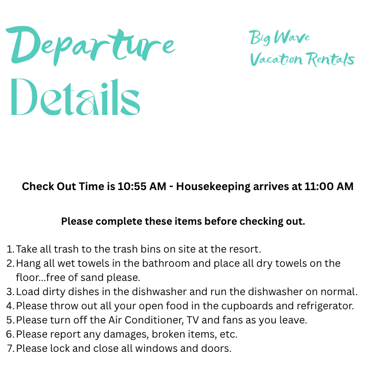 Please look over the condo upon arrival and if anything is not satisfactory or not working please let us know so we can correct it.